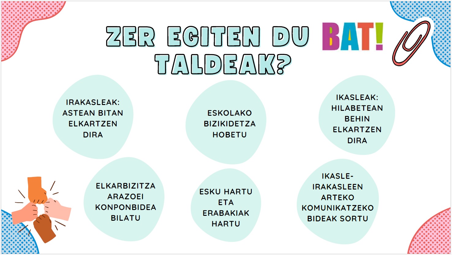 Elkarbizitza positiboaren alde lan egiteko prest dauden ikasle bolondresek osaturiko taldeak dira. Mailaka antolatuta, gela bakoitzeko 4-5 ikasle hilabetean behin biltzen dira, BAT taldeko kideren baten gidaritzapean.