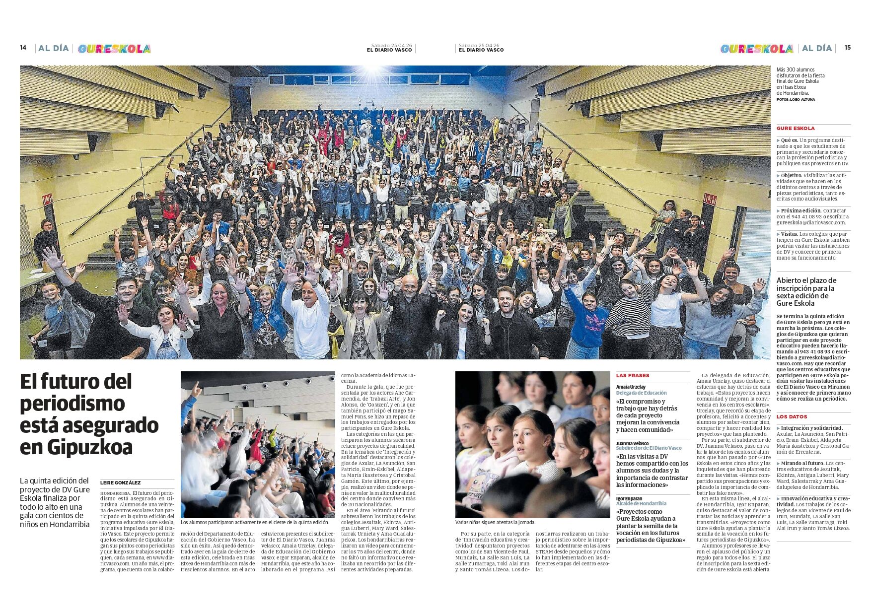L@s alumn@s de 1º de la ESO asistieron en Hondarribia al acto de clausura de «Gure Eskola», organizado por el Diario Vasco, junto a unos 300 alumnos de una veintena centros escolares de Gipuzkoa.